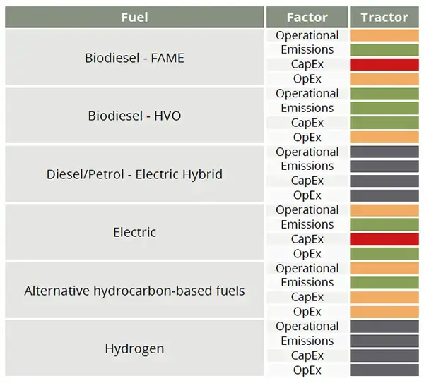 A comparison of the potential alternative fuel options has been carried out for tractors as an example. Table 6 highlights the current situation. A red/amber/green (RAG) reporting system is used.